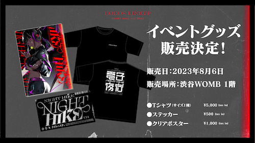 『NIGHT HIKE』をイメージしたオリジナル単語『電子夜行』がバックプリントにデザインされたTシャツ、オリジナルステッカー、イベントのキービジュアルを使用したクリアポスターの3点が限定で登場します。レアアイテムとなること必死のオリジナルグッズを是非ゲットしてください!!