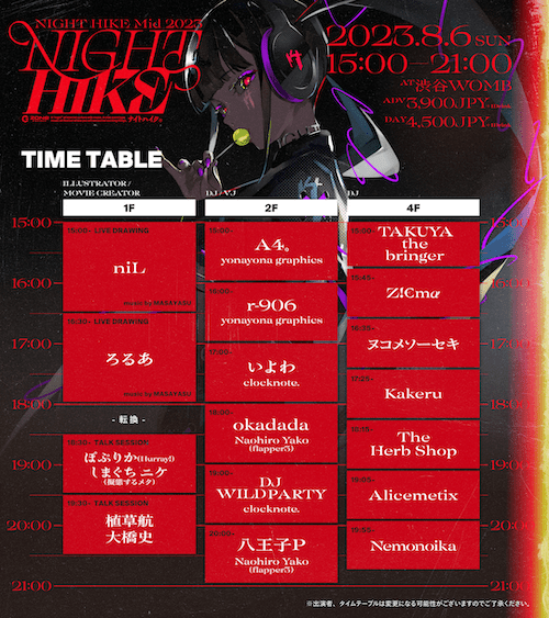 2023年8月6日(日)渋谷WOMBにて行われる『NIGHT HIKE』は、音楽・イラスト・映像が一堂に会する新たなネットカルチャーのミュージックアートフェスとして、開催発表と同時に大きな話題と注目を集めています。