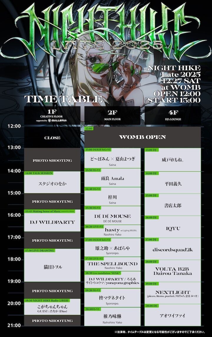 ●NIGHT HIKEは、ネットカルチャーを重んじ、これまで知らなかった音楽やアート、映像を中心にアーティスト、クリエイターによる「創造との新たな出会い」を体験していただくことを一つの大事なテーマと考えています。私たちはどの時間帯にどのフロアでも、皆さんにそういった創造との出会いをお届けできるようなタイムテーブル作りやブッキングに努力し続けます。混雑時に目当ての演目が見れずにご不便をおかけする場合もございますが、そういったイベントの特性も含めてお楽しみいただけますと幸いです。
